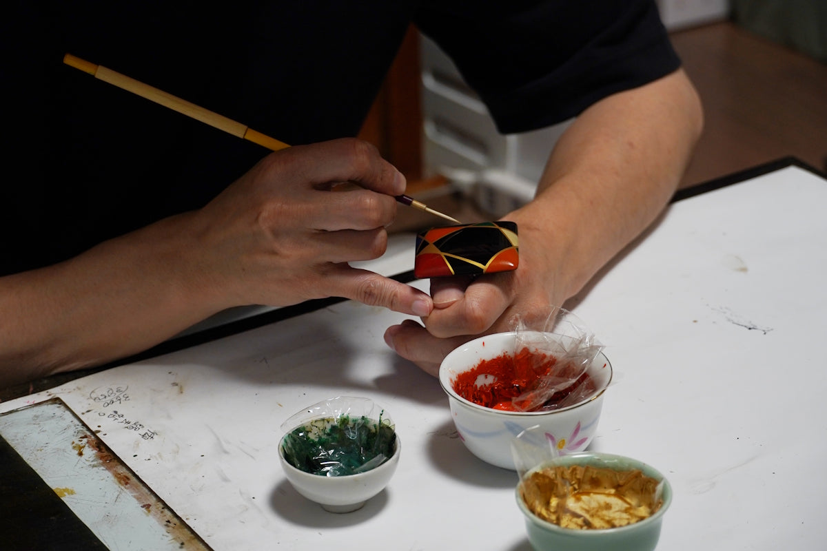 Each gold line is meticulously hand-applied using pure gold powder, while vibrant areas of colored urushi lacquer are carefully finished by hand, resulting in a lively, polished appearance.